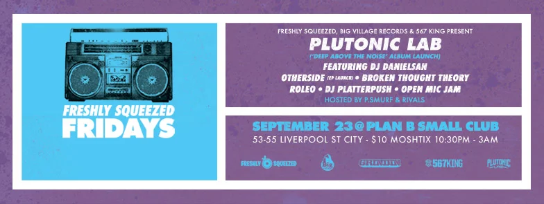 Freshly Squeezed Fridays presents the album launch for one of the most highly regarded producers in the country, Plutonic Lab (one half of group Muph & Plutonic). With A career spanning over 20 years, Plutonic Lab’s eclectic music production has provided the backdrop for a vast number of artists with over 80 releases locally and Internationally on several record labels including work with, Guilty Simpson, Miles Bonny (US), Notes To Self (Canada), G-Love (US), Coma-Chi (Japan) Renee Geyer, Dialectrix, Drapht, Hilltop Hoods, Wiley (UK), Speech Debelle (UK), Task Force (UK), Fat Lip (Pharcyde), Eternia (Canada), The Grouch & Eligh (US), amongst many, many more.
